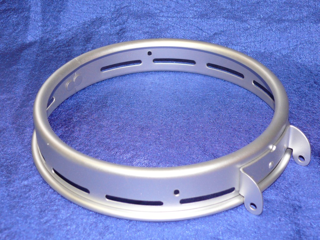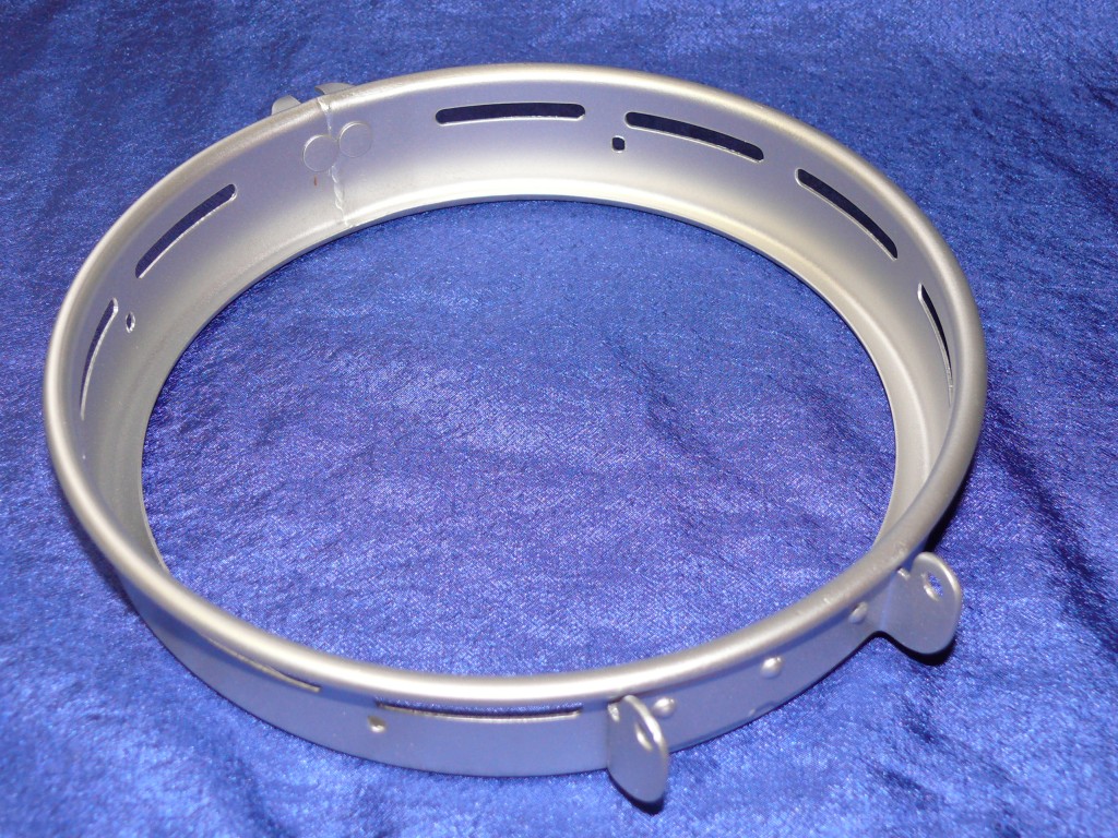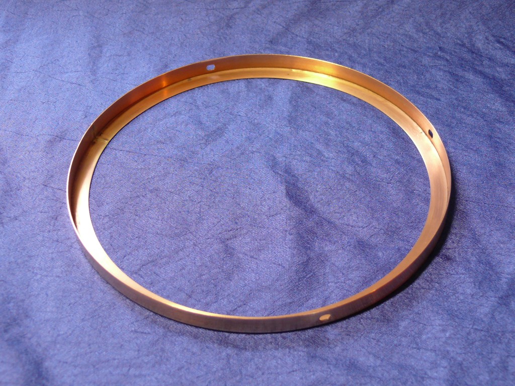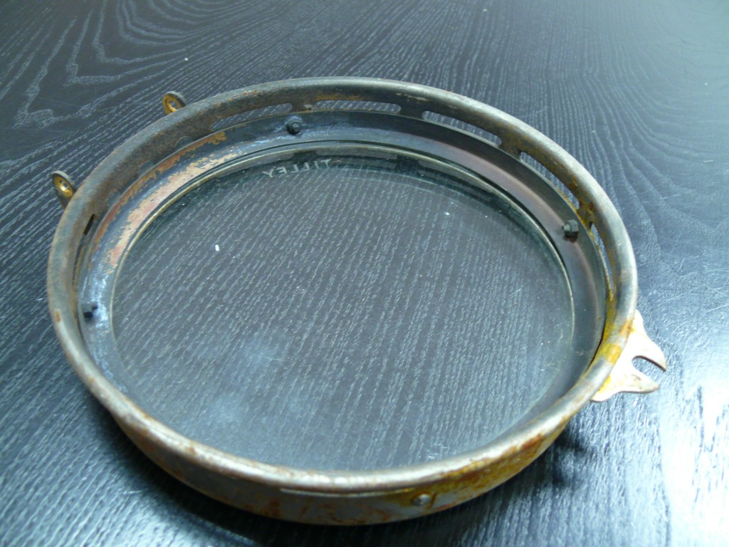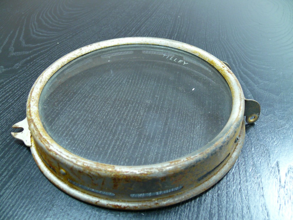 Als erstes wird die Glasscheibe demontiert. Die Scheibe wird bei dieser Lampe mit einem Kupferring in dem Blechrahmen gehalten.