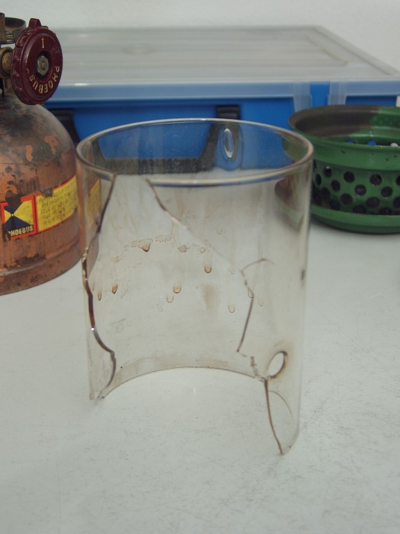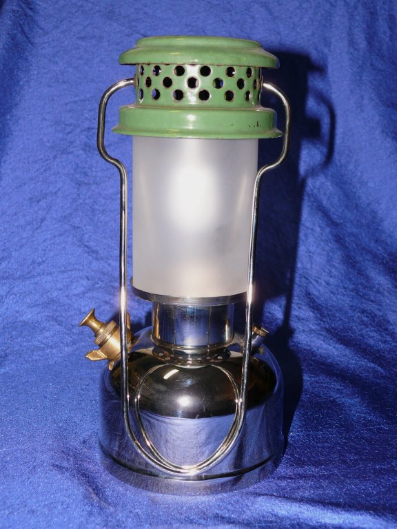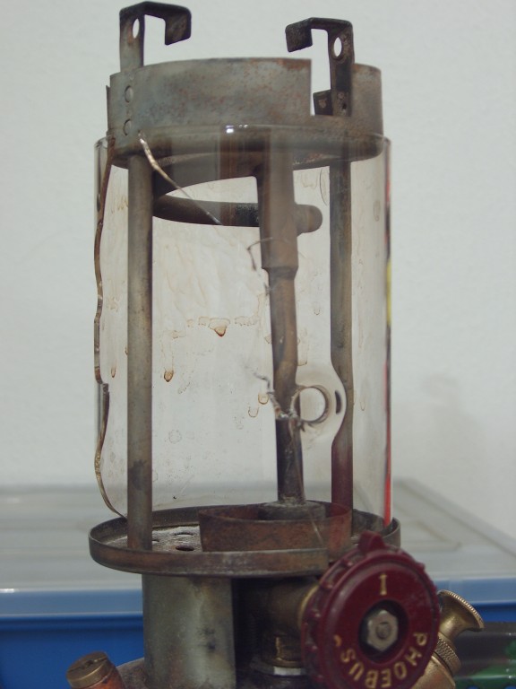 Brennstoff eingefüllt, ähnlich wie bei einer Tilley. Im Glas ist ein Loch, durch das die Vorwärmschale mit Spiritus gefüllt und