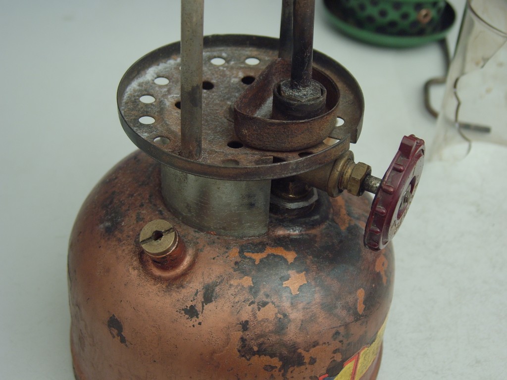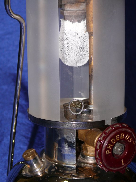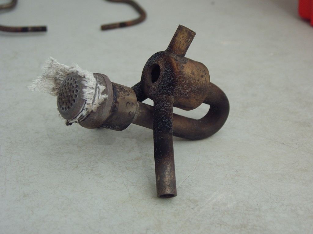 nicht vernünftig zum laufen. Deswegen habe ich das Oberteil des Vergasers mit Messinggaze ausgestopft, und die Lampe leuchtet